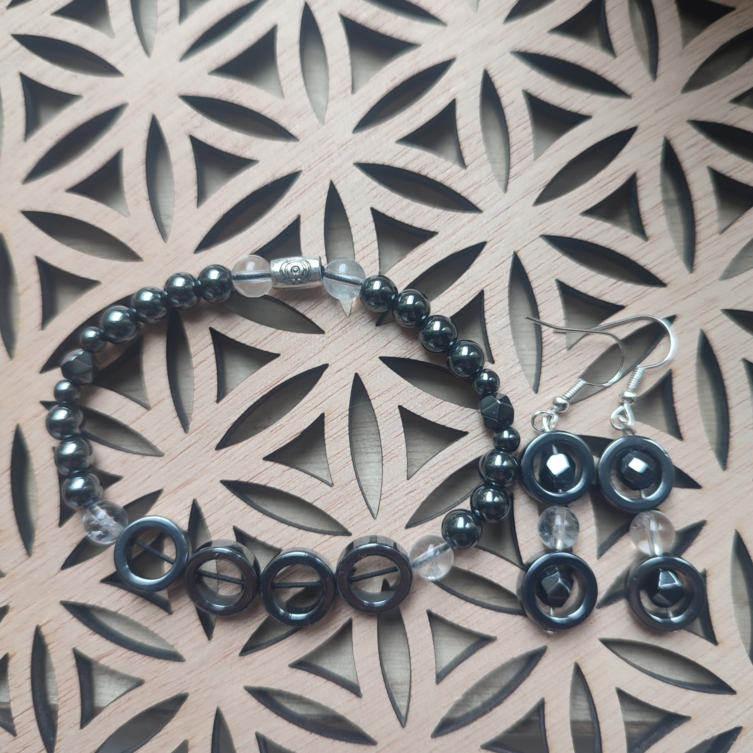 Cette jolie parure bracelet – boucles d’oreilles en Hématite (billes de 6 mm en cube, facettée, cerclée), apportera charme et originalité à toutes vos tenues.